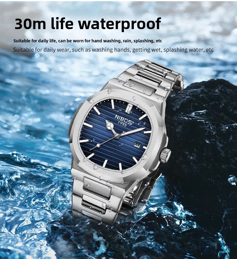 Waterproof - 30-meter water resistance suitable for daily wear and minor water exposure.